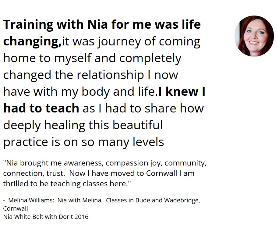 * Nia combines dance arts, martial arts, and mindfulness into a joyful, embodied movement practice. It’s more than a workout — it’s self-expression, wellbeing, and mindful teaching.